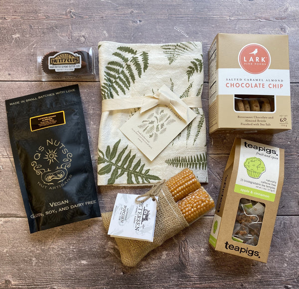 This gift box will include a tea towel and a mix of delicious food, drinks, and other useful kitchen items.