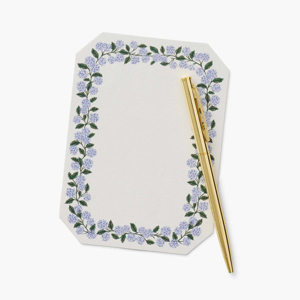 Jot down your reminders or leave a note for someone special. Organized in a pretty desktop box, this note writing set includes 130 flat notes with hydrangea illustrations and a matching gold pen.