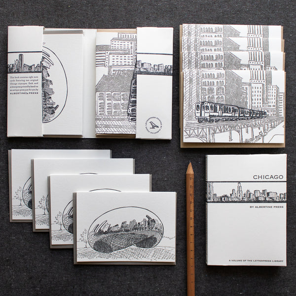 Sets of eight, blank, 4-bar sized cards are designed and letterpress printed on an antique press in our Cambridge studio, just for you, by Albertine Press.