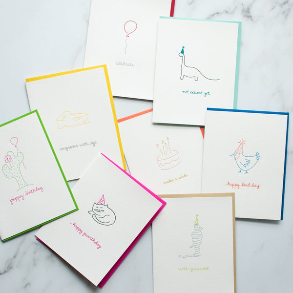 One each of some of our favorite Albertine Press birthday cards! All printed by hand in our Cambridge studio.