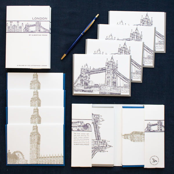 Sets of eight, blank, 4-bar sized cards are designed and letterpress printed on an antique press in our Cambridge studio, just for you, by Albertine Press.