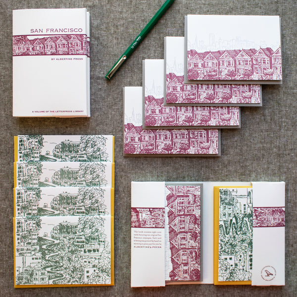 With packaging reminiscent of old book covers, each volume in the Letterpress Library collection by Albertine Press contains a set of eight decorative note cards and envelopes.